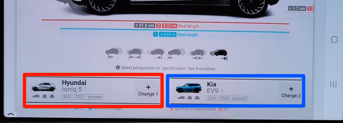 두 번째는 검색창에 영어로 carsize를 입력하면 아래처럼 자동차의 실제 크기를 이미지로 비교해 주는 사이트가 나오는데요 비슷한 다른 사이트들은 보통 자동차의 전장, 전폭, 전고 등 자동차의 제원을 숫자로만 보여줘 감이 잘 안 왔는데 carsize에서는 내가 관심 있는 차를 2개 고르고 자동차 이미지 하단에 있는 버튼들을 누르면 위치별로 정확히 얼마나 크기 등이 차이가 나는지 cm 미터 단위로 보여주고 심지어 옆면뿐만 아니라 앞 / 뒷면도 비교가 가능하니 아주 직관적으로 심게 확인이 가능합니다.