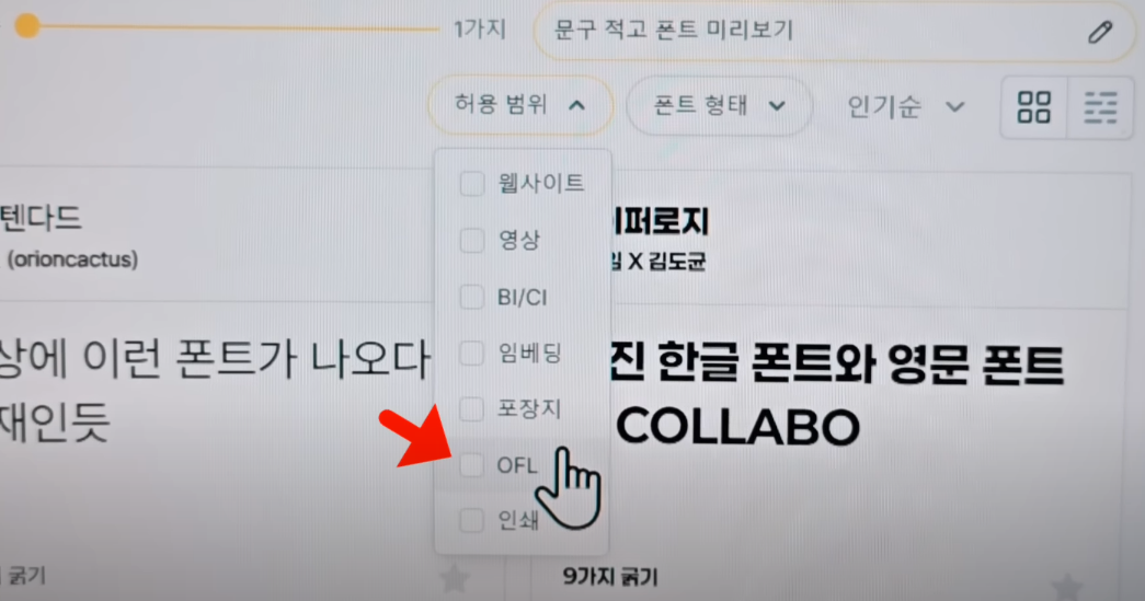 마지막은 '눈누'라는 사이트 인데요 사이트에 들어가면 오른쪽에 '모든 폰트' 를 클릭한 다음 허용범위를 누르면 OFL 메뉴가 보입니다. 거기에 체크를 하면 앞으로 나오는 모든 글자들은 이 폰트 자체를 돈 받고 유료로 판매하지 않는 한 저작권 걱정없이 어디든 자유롭게 사용이 가능하니 여기서 자유롭게 안심하고 사용하면 되겠습니다.