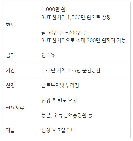 직업훈련 생계비 대출의 가장 큰 장점은 장기간 저금리로 이용을 할 수 있는 점입니다. 금리가 무려 1.0%입니다. 그리고 최대 3년 거치 5년 분할상환이 가능합니다. 특히 최대 1,000만 원 이었던 한도는 한시적으로 6월까지 1,500만 원으로 증액을 하였습니다. 기존 이용자는 500만 원을 추가로 이용할 수 있습니다.