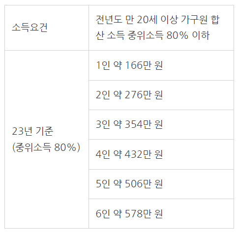 소득요건은 중위소득 80% 이하입니다. 만 20세 이상 가구원 합산 월소득으로 판단을 합니다.