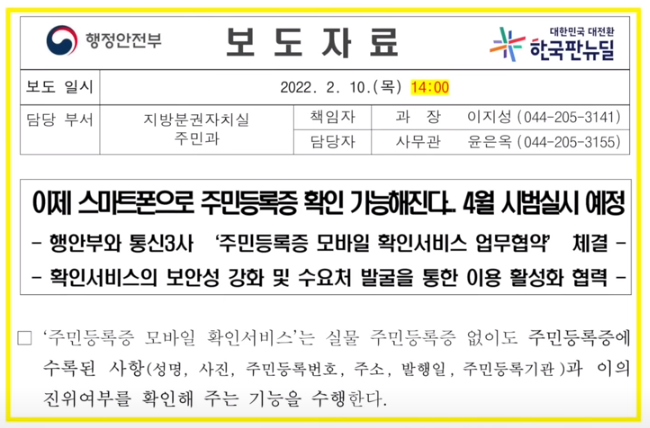 그리고 QR코드는 신분증을 확인하는 쪽에서 진위여부를 확인하는데 사용할 수 있습니다. 보도자료에서 내년부터 사용이 가능하다고 한 것은 내년부터 카드 주민등록증을 대체할 수 있는 모바일 주민등록증이 발급된다는 것이고 이미 2022년 작년 1월 11일부터 주민등록법이 개정되면서 '주민등록증 모바일 확인서비스'를 이용해 신분을 확인한 경우 실물 주민등록증을 확인한 것과 동일한 효력을 갖도록 변경이 되었습니다.
