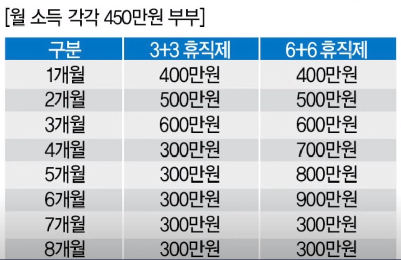 첫 6개월 육아휴직 기간에 각각 최대 1,950만 원씩 부부합산 3,900만 원을 육아휴직 급여로 받을 수 있는데요 6개월 차에는 기존에 박 전 월급의 100%인 예를 들어 맞벌이 부부의 월급이 각각 450만 원이라면 육아휴직을 사용한 첫 달에 200만 원씩 400만 원을 받고, 6개월 차에는 기존에 받던 월급의 100%인 450만 원씩 총 900만 원을 받는 방식입니다.
