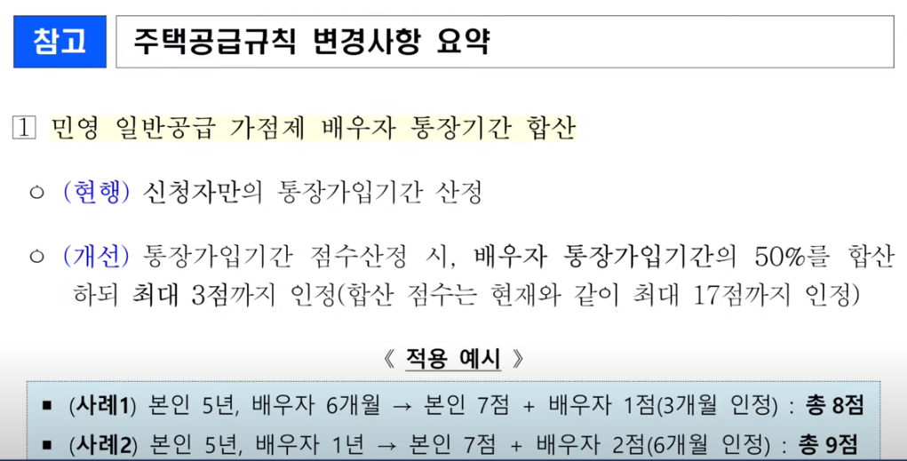 또한 1월 1일부터 청약통장 가입 기간을 계산할 때 배우자 통장 가입 기간의 50%를 합산해 줘서 최대 3점까지 가산 점수를 받을 수 있게 됩니다.