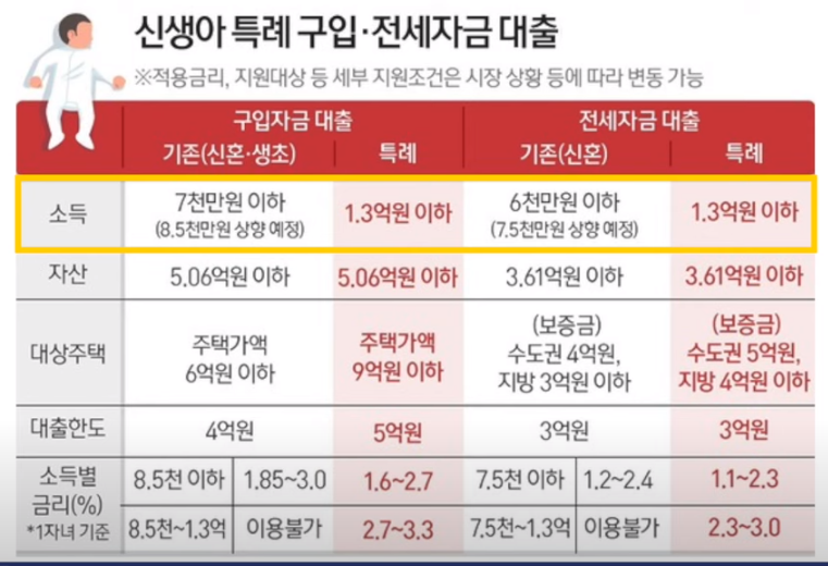 다음은 부동산과 관련된 내용인데요 먼저 신생아 특례 대출이 새롭게 생깁니다. 소득별로 금리가 조금씩 다르지만, 주택 구입 자금 대출이나 전세자금 대출을 약 1.1% ~ 3.3%의 저금리로 대출받을 수 있는데요 구입자금 대출과 전세자금 대출 공통 조건으로 부부합산 연 소득 1억 3천만 원 이하의 무주택자여야 하고요 올해 2023년 출산부터 적용됩니다. (혼인 여부 무관)