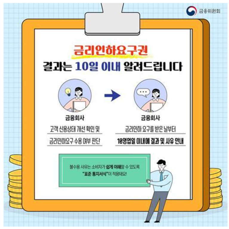 금리인하요구권을 신청하게 되면 10일 이내에 인하 여부에 대한 결과를 회신받게 됩니다. 금융회사는 고객의 신용상태 개선에 대한 내용을 확인하고 금리인하요구 수용 여부를 판단 뒤 신청을 받은 날부터 10 영업일 이내에 결과와 사유를 안내하게 됩니다. 만약 인하가 인정되지 않는 불수용 사유에 대해서는 소비자가 쉽게 이해가 가능하도록 표준 통지서식을 적용하여 안내됩니다. 우편이나 모바일 메시지 또는 이메일이나 유선으로 결과를 통보받을 수 있습니다.