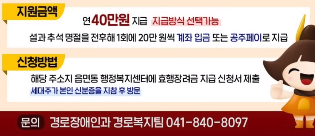 3대 중에 세대주가 누구이든 상관없이 세대주가 본인 신분증을 가지고 주소지 읍면동 행정복지센터에 방문해서 효행장려금 지급 신청서를 작성해서 제출하셔야 하고요 설 명절에 20만 원, 추석 명절에 20만 원 총 40만 원이 계좌로 현금 입금되거나 지역화폐인 공주 페이로 지급된다고 합니다.