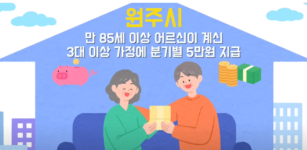 강원도 원주시는 만 85세 이상 어르신이 계시는 3대 이상 가정에 분기별로 5만 원을 지원하고, 충북 보은의 경우 원주시와 동일한 조건이지만 분기별이 아니라 매월 5만 원을 지원한다고 합니다.