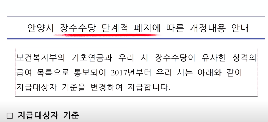 딱 만 88세 어르신에게만 주는 지역 그리고 매월 주는 지역, 분기에 한 번씩 1년에 4번 주는 지역, 1년에 한번 주는 지역, 아니면 평생 딱 한 번만 주는 지역도 있어서 몰라서 신청을 못한다거나 신청할 수 있는 기간을 놓쳐서 신청을 못하시는 분들도 계십니다. 예를 들어 안양시의 경우에는 2017년 이후부터 장수수당 신규 신청이 없어졌는데요 그래서 만 85세 이상 어르신들에게는 매월 2만 원, 만 90세 이상인 분들은 매월 3만 원이 지급되는데, 신청 기간에 신청하신 분들은 평생 매월 2~3만 원의 수당이 나오지만 이 기간을 놓치신 분들은 한 푼도 받을 수 없습니다.
