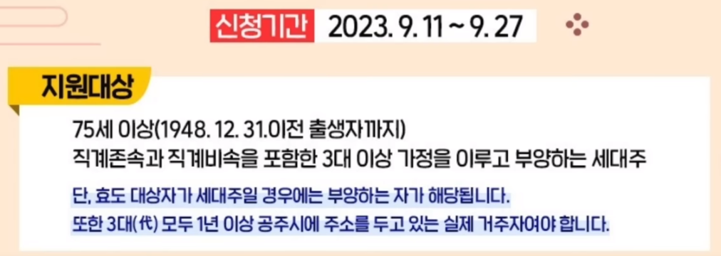 전국 지자체 모두 확인 시 약 90여 개의 전국 지자체에서 이러한 지원금을 지급한다고 하였습니다. 먼저 9월 11일부터 신청 시 시작되는 지역으로 공주시입니다. 신청 기간은 9월 11일부터 추석 연휴 하루 전날인 9월 27일까지이고 지원 대상은 75세 이상 직계존속과 직계비속을 포함한 3대 이상 가정을 이루고 부양하는 세대주가 대상입니다.