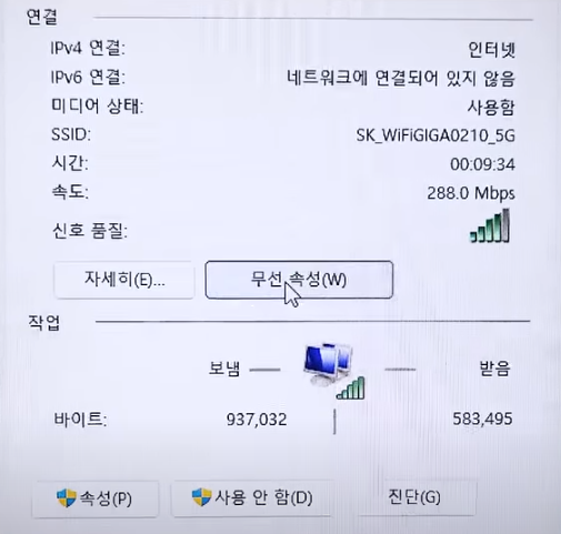더블 클릭해서 실행 -> 그다음 나오는 화면에서 '무선 속성'이라는 메뉴를 클릭합니다. 다음 상단에 보이는 '보안' 탭을 클릭해 주면 이렇게 와이파이 비밀번호가 가려져 있는데 그 아래 '문자 표시'에 체크를 하면 비밀번호가 보이는데요 바로 이걸 스마트폰에 입력하면 와이파이가 잘 연결되실 겁니다.