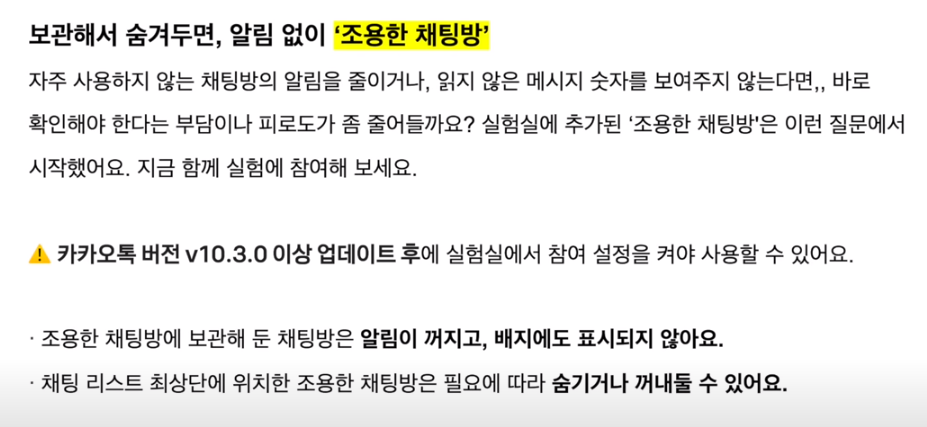 카카오톡이 편리하긴 하지만 너무나 많은 단톡방이 생기고 하루 종일 대화로 인한 스트레스 등 일상 속에서 채팅 자체가 부담이 되는 경우도 있는데요 이러한 문제점을 해결하기 위한 프로젝트가 지난 5월부터 시작된 '카톡이지(Easy)'고요 이후에 '채팅방 조용히 나가기' 기능이나, '조용한 채팅방' 등의 기능이 생겼습니다.