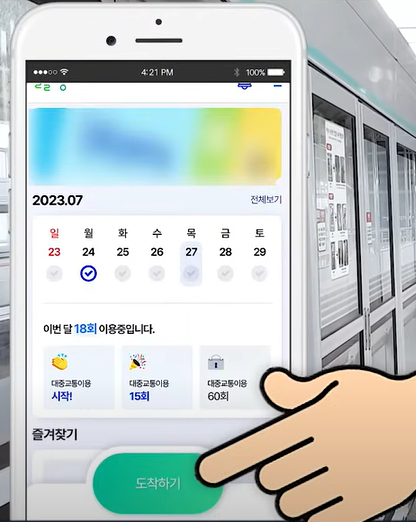 이렇게 외출하기 전에 알뜰교통카드 앱에서 출발 버튼을 클릭하고 평소처럼 지하철역이나 버스정류장까지 걷거나 자전거로 이동, 그리고 알뜰교통카드로 결제를 하고 대중교통을 통해 목적지까지 쭉 이동하다가 최종 목적지에 도착해서 앱의 도착 버튼을 누르면 마일리지는 자동으로 이동한 거리에 따라 최대 6만 6천 원까지 적립이 되는 방식이에요 그래서 평소에 대중교통을 많이 이용하시는 분들한테 좋겠죠?