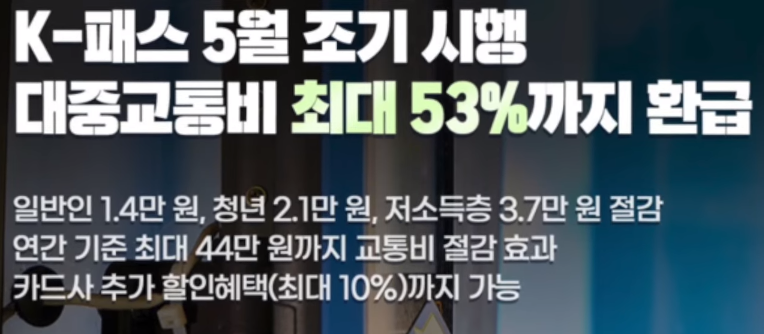 K패스만 사용하실 수 있는데요 K패스는 기존 알뜰교통카드의 문제점을 개선하고 혜택은 더 강화했는데요 월 15회 이상 정기적으로 대중교통을 이용할 경우 지출 금액의 일정 비율을 환급해 주고, 월 최대 60회까지 환급이 가능하다고 합니다. 이때 일반 국민들은 20%, 청년층은 30%, 저소득층은 53%를 환급받을 수 있는데요