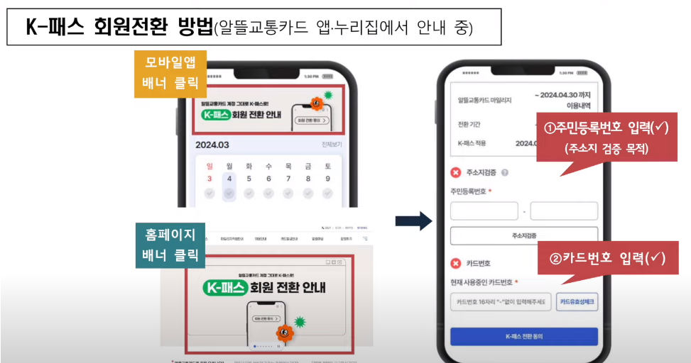 그 전까지 전환을 미리 완료하지 않으면 회원 전환을 완료하기 전까지 환급 혜택을 받을 수 없는데요 회원 전환하는 방법은 알뜰교통카드 홈페이지나 앱에서 현재 사용중인 알뜰교통카드 카드번호를 입력하고, 주소지 검증을 위한 주민등록번호 입력 그리고 이용약관 등 동의만 하면 됩니다.