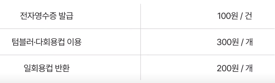 코카콜라나 삼다수, 퐁퐁 주방세제까지 의외로 친환경제품으로 들어가서 모두 포인트 지급 대상인데요 이렇해 한번만 신청해 놓으면 1~2,000원이 거의 매번 자동으로 적립되는데 신청을 하지않을 이유가 없겠죠? 스타벅스나 편의점도 자주 가실 텐데요 마찬가지로 전자영수증 발급 시 100원, 텀블러나 다회용컵 이용 시 300원, 일회용컵 반환시 200원을 받을 수 있습니다.