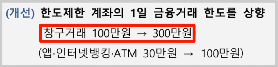 네 번째 소식은 은행 업무를 볼 때 ATM 기기에서 돈을 인출하려고 하면 한도 제한 계좌라고 하면서 1日 거래 한도가 30만 원이라 곤란하고 난처한 경험을 하신 적 있으실 텐데요 이것도 바뀌었습니다. 아무리 한도 제한 계좌라도 은행 창구를 통한 거래는 100만 원에서 300만 원 / 앱. 인터넷 뱅킹. ATM을 통한 거래는 30만 원에서 100만 원으로 상향이 되었습니다.