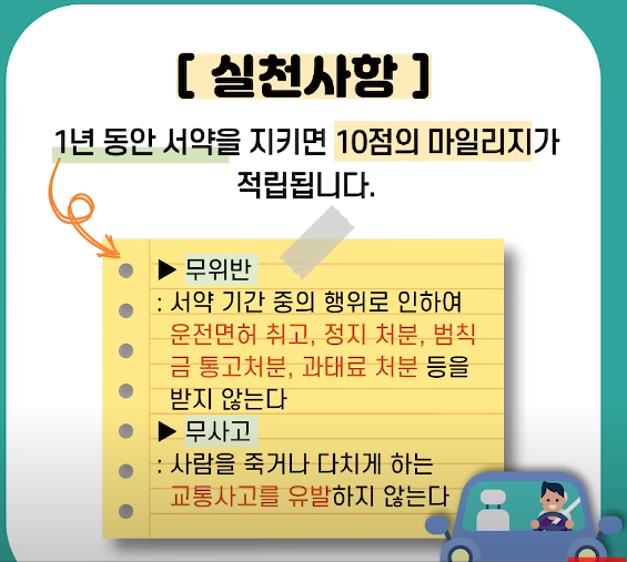 그리고 두 번째는 '착한 운전 마일리지'인데요 만약 이미 신청하신 분들은 그래도 오늘 생각난 김에 얼마나 쌓였는지 확인을 해보시고, 아직 신청을 하지 않은 분들은 무료니까 다른 건 몰라도 이 제도는 꼭 신청을 하셨으면 좋겠습니다. 먼저 착한 운전 마일리지는 내가 만약 교통법규를 잘 지키겠다고 서약을 한 다음 1년 동안 잘 유지를 하면 마일리지를 적립해 주는 제도인데요