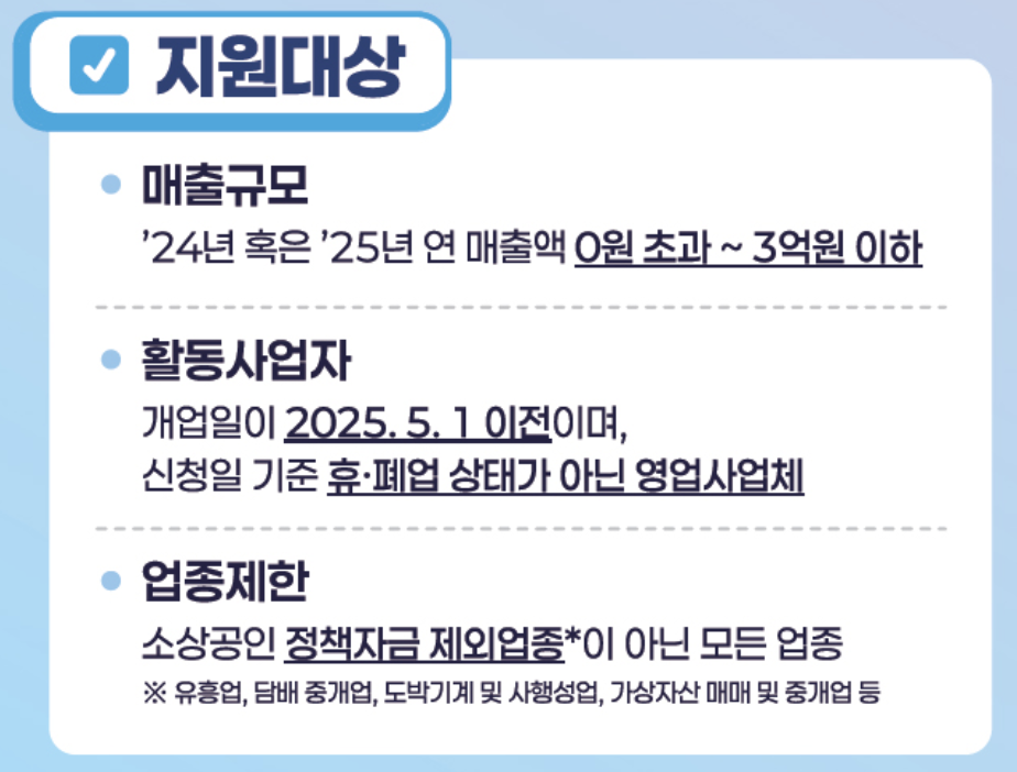 - 활동사업자 : 개업일이 2025.05.01일 이전이며, 신청일 기준 휴·폐업 상태가 아닌 영업사업체