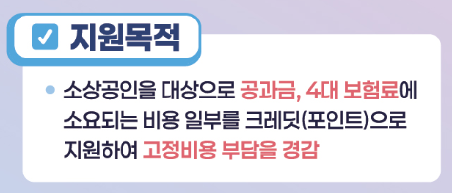 소상공인을 대상으로 공과금, 4대 보험료에 소요되는 비용 일부를 크레딧(포인트)으로 지원하여 고정비 부담을 경감할 수 있도록 지원합니다.
