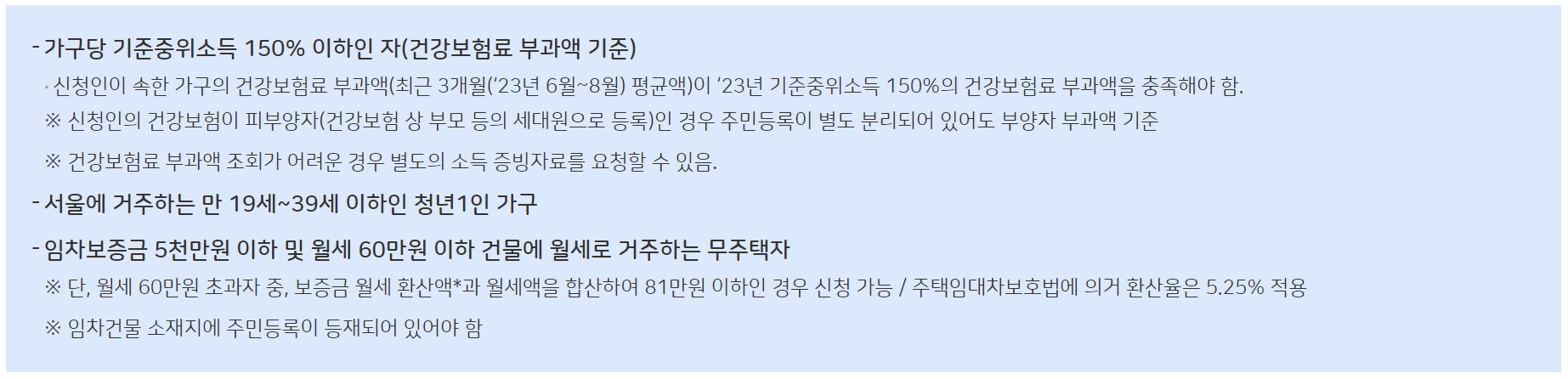 - 기준 중위소득 150% 이하 청년 1인 가구 ※23년 이전 서울시 청년 월세 지원 기 선정(수급) 자, 국토교통부 청년 월세 한시 특별 지원 선정(수급) 자 및 23년 은평형 청년 월세 선정(수급) 자는 지원 불가