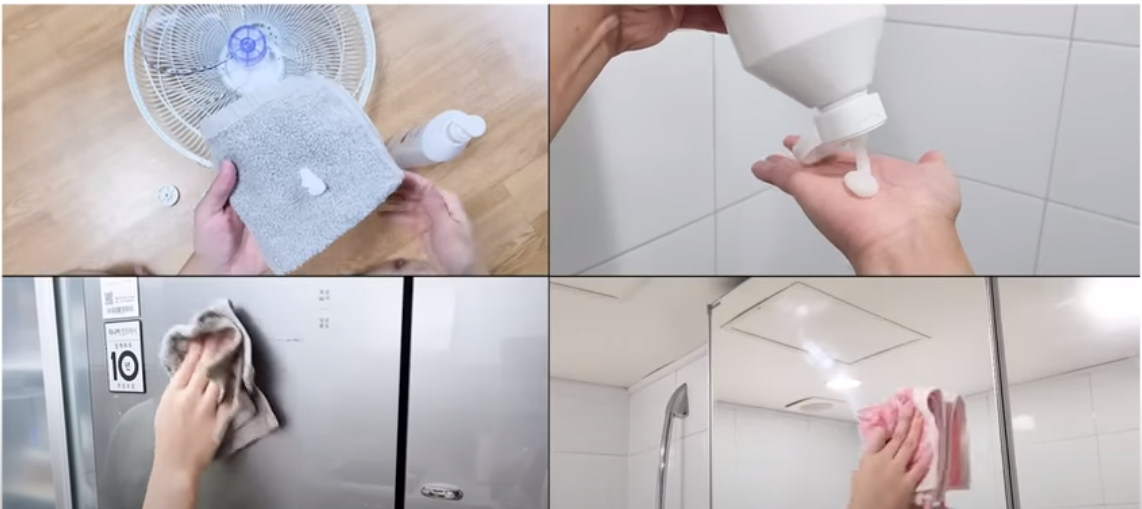 두 번째는 냉장고에 활용하는 방법입니다. 냉장고를 오래 사용하다 보면 냉장고 표면에 지문이나 얼룩들이 많이 묻는데요 특히 스테인리스 냉장고나 강화유리로 된 냉장고는 얼룩이 더 잘 보입니다. 아마 대부분 물티슈나 또는 청소걸레를 이용해서 청소를 하셨을 텐데요 물티슈는 특유의 물 얼룩이 남아서 더 지저분해지는 경험을 하셨을 겁니다. 이때 린스를 활용하면 린스의 코팅 성분과 소량이지만 세정제도 들어있어 얼룩을 지우고 또 얼룩이 생기는 것을 막아줍니다.