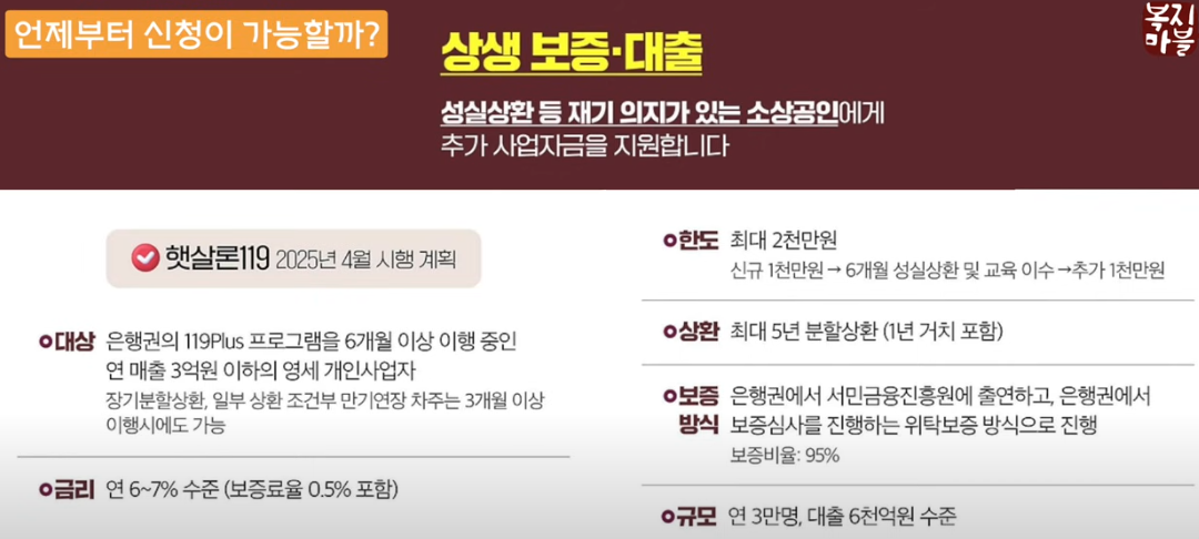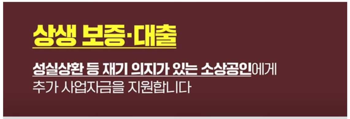 그 외에도 성실상환자 경쟁력 제고 가능 소상공인 등 재기의 의지가 있는 사업자에 대해서는 추가 사업 자금을 받을 수 있는 소상공인 상생 보증·대출도 같이 출시되는데요 사업 운영을 위한 신규 운전자금 보증부 대출을 지원하도록 하는 '햇살론119', 경쟁력 강화가 가능한 소상공인에 대해 추가적인 설비·운전자금 보증부 대출을 공급하는 '소상공인 성장 up' 등이 지원될 예정입니다.
