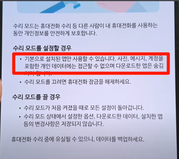 그리고 진짜 중요한 건 방금 설정 화면에 보면 디바이스 케어라고 있는데요 클릭하고 내리면 가장 밑에 수리 모드라고 있는데 앞으로는 수리할 때 무조건 이 버튼을 누른 다음 맡기세요 이 기능을 켜면 사진이나 메시지 같은 개인 정보에 접근하지 않고도 수리가 가능하기 때문입니다.