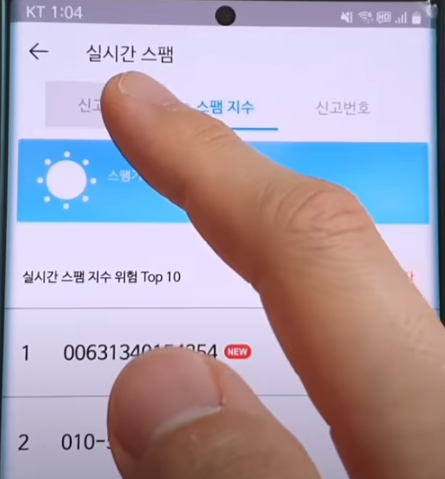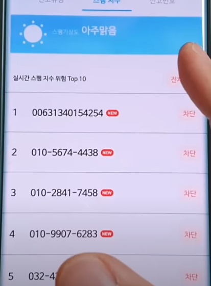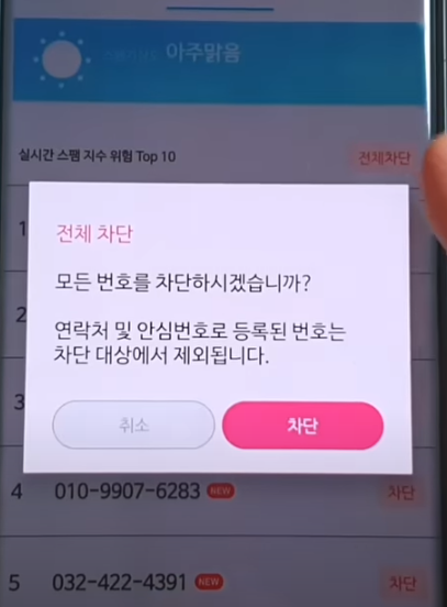 그리고 마지막 꿀팁으로 앱 화면의 하단을 보면 실시간 스팸 랭킹이라고 해서 실시간으로 스팸 지수가 높은 연락처들이 확인됩니다. 그럼 오른쪽 상단에 전체차단를 클릭 -> 팝업이 뜨면 차단을 클릭