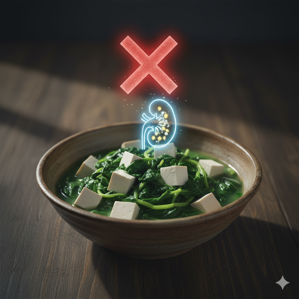시금치의 옥살산은 칼슘과 만나면 옥살산칼슘이라는 불용성 물질을 만듭니다. 이 옥살산칼슘은 체내 칼슘 흡수를 방해할 뿐만 아니라, 흡수되지 않고 남은 옥살산칼슘이 신장에서 쌓여 **신장 결석(요로결석)**의 원인이 될 수 있습니다. 따라서 칼슘이 풍부한 두부, 멸치를 함께 넣은 된장국, 또는 우유, 치즈 등의 유제품과 시금치를 같은 식사에 다량 섭취하는 것은 피하는 것이 좋습니다.