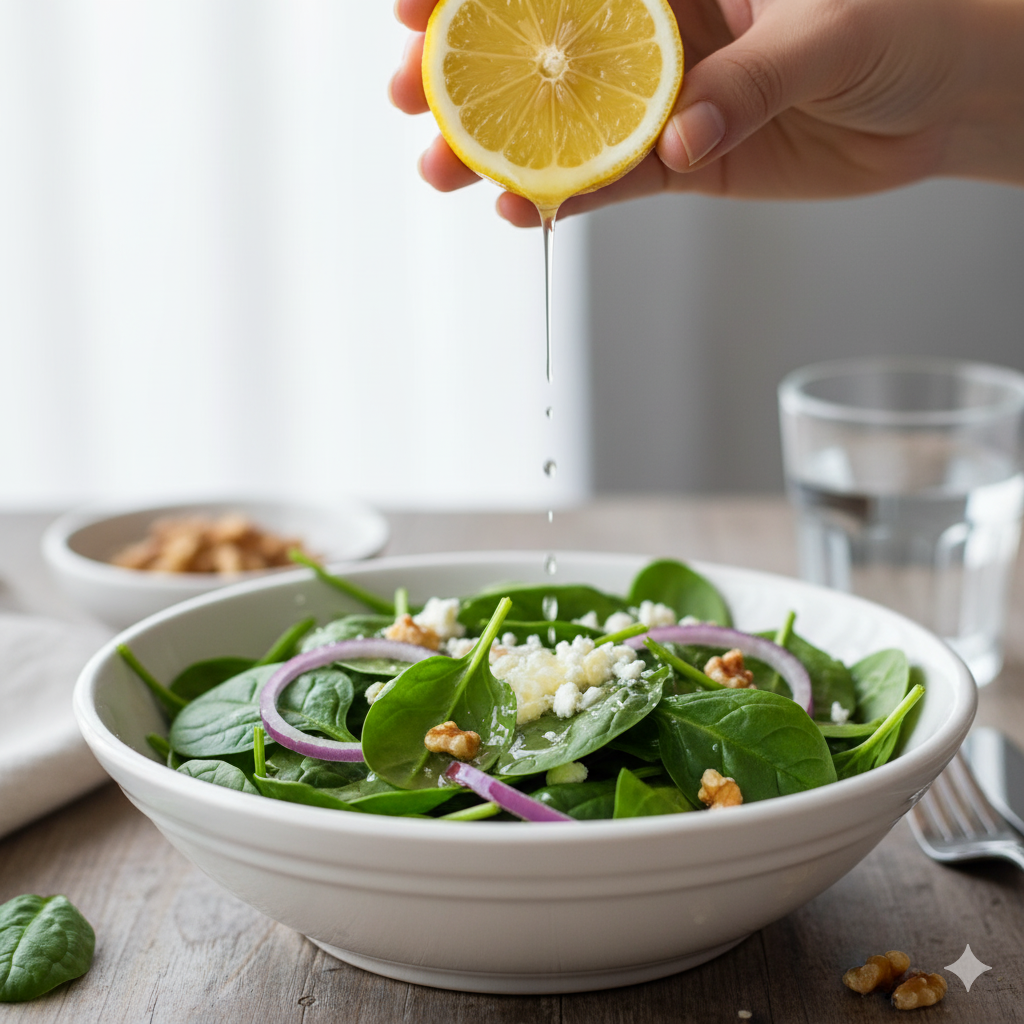 시금치 속 철분은 비타민 C와 함께 섭취할 때 흡수율이 크게 높아집니다. 레몬, 라임, 오렌지 등 비타민 C가 풍부한 감귤류는 시금치 샐러드에 드레싱으로 활용하기 좋습니다. 간단하게 시금치 샐러드에 레몬즙을 뿌려 먹기만 해도 철분 흡수 효과를 볼 수 있습니다.