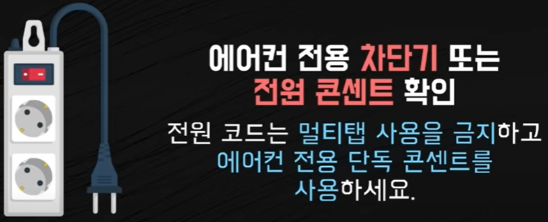▶에어컨 전원 점검 시 콘센트를 멀티탭으로 사용하는지? 일부 에어컨 전용 콘센트가 설치된 곳은 해당 에어컨 전용 차단기에서 전원이 차단되는 전원 문제가 있을 수 있습니다.