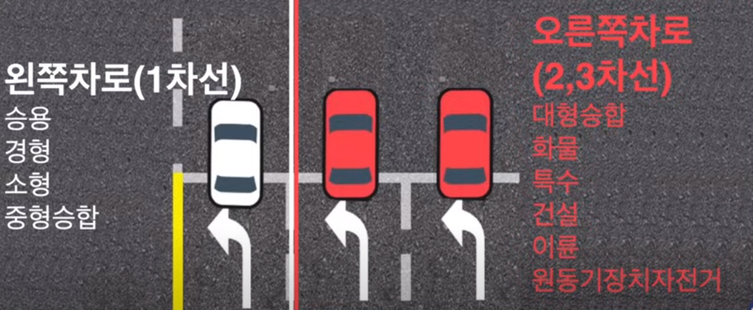 그리고 가장 헷갈려 하시거나 잘못 알고 계신 분들이 많은 좌회전, 직진, 우회전 표시인데요 먼저 큰 도로에서는 좌회전 차선이 두 개 이상 있는 곳이 있습니다. 이때에는 '지정 차로제'가 적용되는데요 좌회전 차선이 2개인 경우에는 1차선이 왼쪽 차로, 2차선이 오른쪽 차로 가 되고, 좌회전 차선이 3개인 경우에는 1차선이 왼쪽 차로, 2 & 3차선이 오른쪽 차로 가 되기 때문에 오른쪽 차로만 다닐 수 있는 승합 차나 화물차, 이륜차, 픽업트럭까지 모두 1차선에서 좌회전을 한다면 범칙금이 부과됩니다.