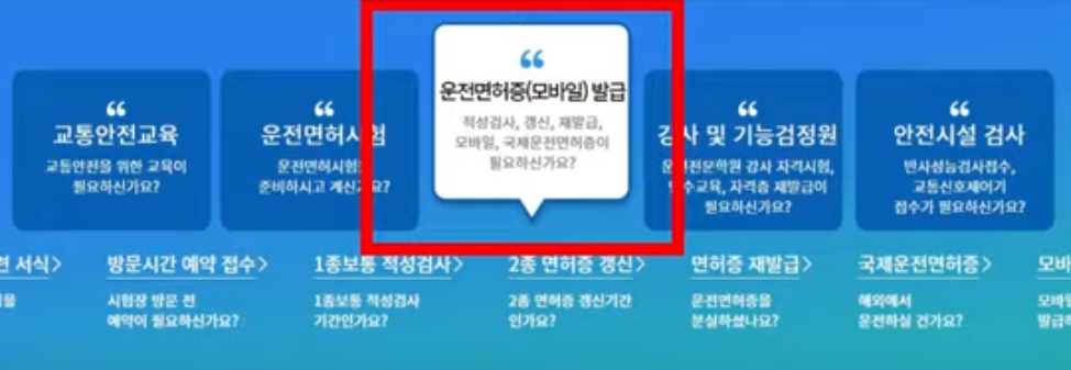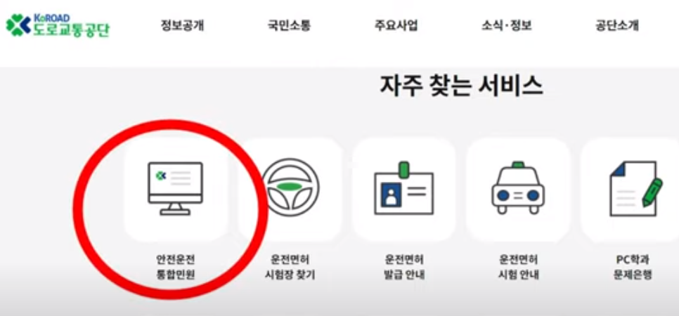 온라인 신청방법은 도로교통공단 홈페이지에 방문하여 아래 안전운전 통합민원을 클릭 후 신청하시면 됩니다. 다만 1종 대형/특수면허 소지자 및 75세 이상 고령운전자, 70세 이상 2종 보통면허 소지자의 경우에는 각기 다른 오프라인 검사(신체장애 판단 신체검사 및 인지선별검사, 교통안전교육 등)를 받다야 하기에 온라인 접수는 불가합니다.