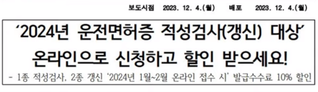 도로교통공단에서 발표한 자료를 살펴보면 2024년 내년에는 운전면허 적성검사 갱신 대상자가 약 140% 증가한 약 400만 명으로 2024년 연말에 몰릴 것을 예방하기 위해 1분기 조기 수검을 당부, 지난 2022년 적성검사 대상자가 약 320만 명 중 약 70만 명이 그해 12월에 면허시험장에 집중, 당시 갱신하기 위해 평균 대기시간이 2시간 이상 걸렸을 정도로 대기시간이 오래 걸릴 수 있기 때문에 올해 대상자인 분들은 미리 받아두시면 좋을 것 같네요 그럼 이제부터 갱신 기간 확인과 발급 수수료 할인 그리고 적성검사까지 빠르게 받는 방법까지 안내를 드리도록 하겠습니다.