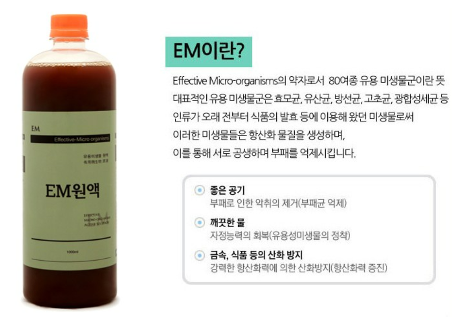 EM(Effective Microorganisms)은 유용미생물군의 약자로써 유산균, 광합성균, 효모균을 주균으로 하여 인간과 환경에 유익한 미생물을 조합, 배양한 미생물복합체를 말합니다. 유용미생물(EM)은 미생물 균들 간의 복잡한 공존·공생 관계를 통해 발효 생성물인 항산화물질을 만들어내게 되는데 악취제거, 수질정화, 금속과 식품의 산화방지, 남은 음식물 발효 등에 탁월한 효과가 있는 것으로 알려져 있습니다.