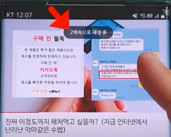 이제부턴 이렇게 해보세요 재생 중인 화면에 그냥 손가락을 살짝 대고 있으면 아래 이미지 화살표처럼 '2배속으로 재생 중' 이 보이는데 다시 손가락을 떼면 정상 속도인 1배속으로 돌아옵니다.