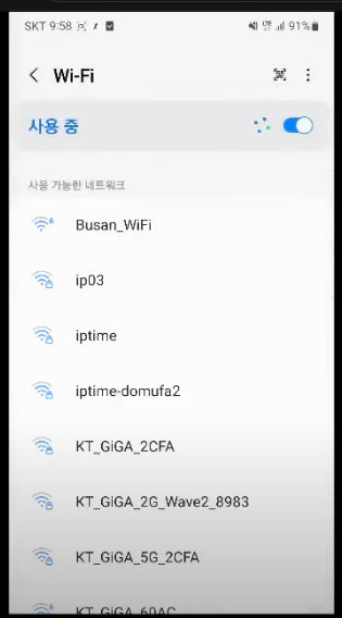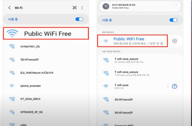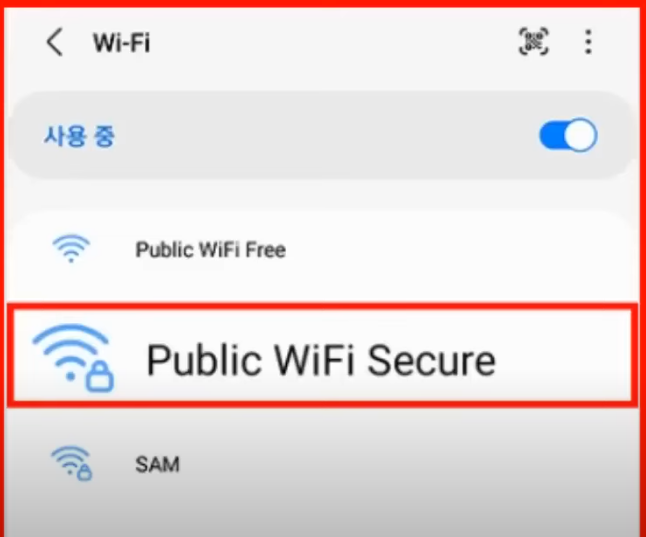 스마트폰에서 와이파이 모양을 눌러주세요 그러면 무선 네트워크 설정으로 들어갈 수 있는데요 -> 주변에 있는 와이파이 신호를 검색, 'Public WiFi Free' 또는 '각 시도 이름'으로 되어있는 와이파이를 선택하시면 암호(비밀번호) 없이 편하게 사용이 가능합니다.