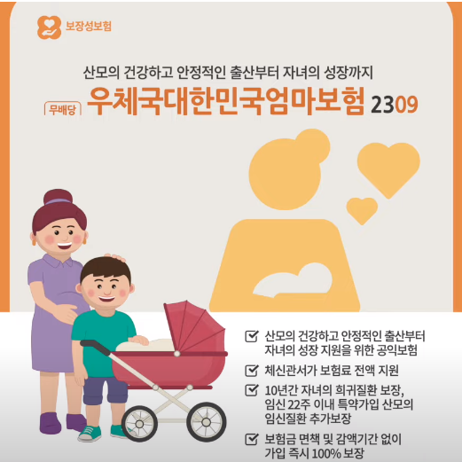 이번에 소개해 드릴 내용은 '우체국 대한민국 엄마 보험'인데요 엄마 보험은 임신부의 임신 질환과 자녀의 희귀질환에 대한 진단비를 우체국에서 '무료'로 보장하는 공익성 보험으로 여성의 출산 부담과 저출산 문제 완화에 기여하기 위해 출시된 보험입니다.