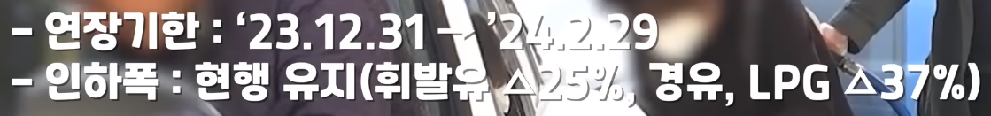 두 번째는 역시 작년 12월 31일까지였던 유류세 인하 정책이 2월 29일까지 2개월 연장됐는데요 현재 휘발유는 25%, 경유는 37% 유류세가 인하된 상태입니다. 잊지 말고 2월 말에는 미리 가득 주유를 해놓는 게 좋겠죠?