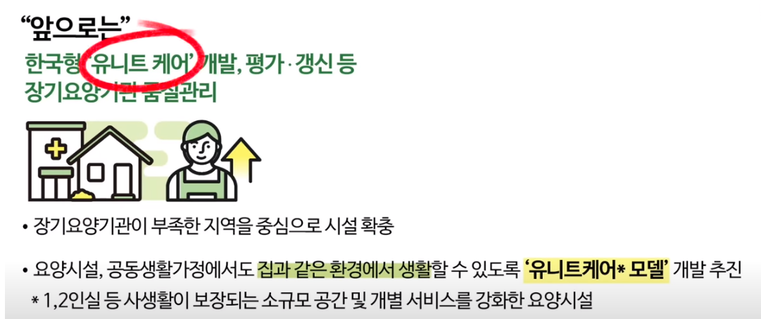 바로 내년부터 도입이 된다고 하는데요 장기요양급여 수가에 이 유트 케어 수가가 별도로 신설될 예정입니다. 정부의 지원으로 수익이 발생하는 구조라서 미래에 요양 시설 창업을 생각하고 계신 분들은 기존에도 노인 요양공동생활 가정이 있었지만 소규모의 유니트 케어 방식으로 사업을 시작하는 것도 고려해 보시면 좋겠고요 그리고 요양보호사분들이 유니트 케어가 일하기에도 더 좋은 근무환경이 될 것으로 예상되기 때문에 요양 시설에 취업을 염두해 두고 계신 분들도 참고하시면 좋겠습니다.