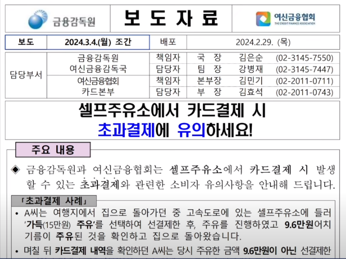 그런데 운전자는 원하는대로 기름이 주유됐으니 그냥 모르고 지나치는 경우가 많은데요 그래서 최근 금융감독원과 여신금융협회에서 셀프 주유소에서 카드 결제 시 초과결제에 유의하라는 보도자료를 발표했습니다. 결론부터 말씀드리면 셀프 주유소에서 카드로 결제하신 다음에 영수증하고 카드사에서 온 문자메시지를 반드시 확인하셔야 하는데요
