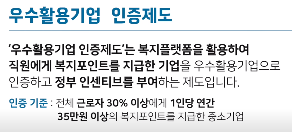재작년에 복지포인트 서비스를 론칭했는데 현재 600개가 넘는 중소기업이 활용하고 있고 재이용 비율 또한 높다고 하였습니다. 복지포인트를 지급하는 중소기업은 정책지원도 받을 수 있는데요 전체 근로자 30% 이상에게 연간 35만 원 이상 복지포인트를 지급하면 '우수활용기업 인증'을 받을 수 있습니다. 인증을 받은 기업은 '성과공유 도입기업'으로 자동 지정되고 병역지정업체 선정 평가 시에 가점이 부여됩니다. 또 중기부 사업 신청 시에도 가점을 받을 수 있다고 하니까 근로자뿐만 아니라 회사에도 큰 도움이 될 수 있을 거라 생각합니다.