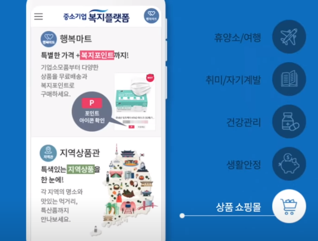 이 외에도 건강검진 할인이나 레포츠 시설 할인, 렌탈, 이사, 상조서비스 등 생활 속 다양한 분야에서 할인 혜택이 있고요 이중 특히 제 눈길을 끄는 것은 대기업 임직원들이 이용하고 있는 복지몰을 중소기업 복지플랫폼에서 똑같은 조건으로 이용할 수 있다는 건데요 국내 1위 복지몰인 '현대이지웰'은 지난 6월 말에 서비스를 오픈, 여행 / 휴양, 자기 계발, 건강관리, 상품구매 등을 복지포인트를 비롯한 다양한 결제수단으로 자유롭게 이용할 수 있게 되었습니다.