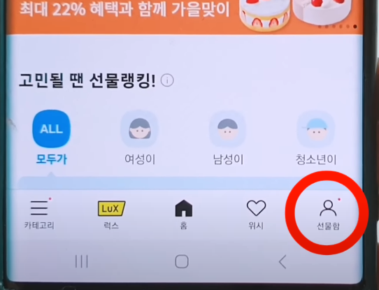 카카오톡에 들어가시면 아래처럼 우측 하단에 점 3개가 보이실 텐데요 클릭하고 들어갑니다. 들어가면 여러 가지 카카오톡 메뉴들이 보이실 텐데요 이중 '선물하기'를 클릭합니다. 클릭하고 들어가서 다시 한번 우측 하단에 점 3개가 보이실 텐데요 클릭합니다.
