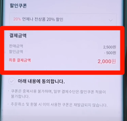 클릭하면 동일하게 이모티콘들이 쭉 보이고 아까 봤던 동일한 200초코 이모티콘을 클릭하고 구매하기를 누르면 중요한 차이가 있습니다. 아래처럼 판매금액은 2,500원이지만 500원이 할인되어 최종 결제금액은 2,500원이 아닌 2,000원이 결제됩니다.
