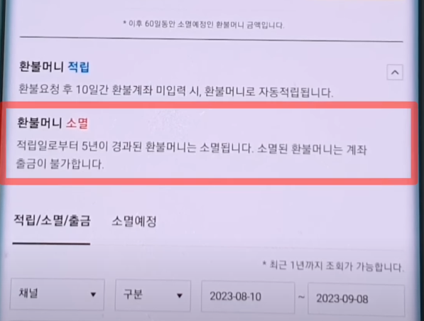 클릭하고 들어가 보면 출금 대 기금이라고 금액이 보이고 우측에 환불계좌로 인출 버튼이 노란색으로 보입니다. 그런데 더 중요한 사실은 적립 일로부터 5년이 경과된 환불 머니는 소멸되고 소멸된 환불 머니는 계좌 출금이 불가하다는 소식입니다.