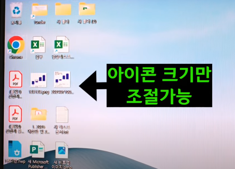 이것도 앞으론 이렇게 사용하세요 그냥 바탕화면에서 Ctrl를 누른 상태에서 마우스 휠을 위 / 아래로 움직여 보세요 그러면 바탕화면에 있는 아이콘 크기만 조절이 가능합니다.