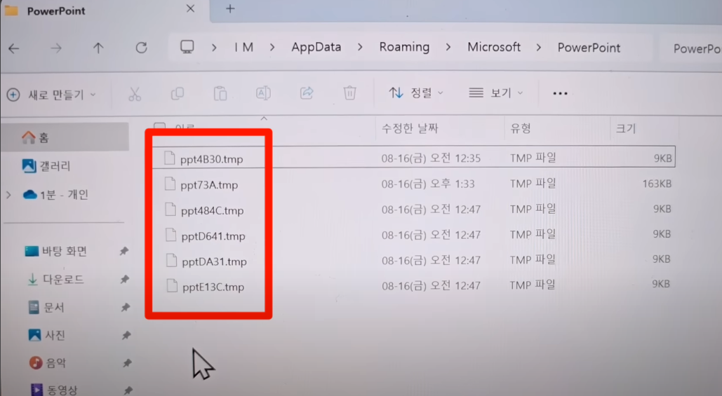 파워포인트 폴더를 또 클릭하고 들어가면 아래처럼 tmp 파일들이 보일텐데 옆에 수정한 날짜에서 삭제한 날짜와 시간을 확인하고 파일 이름 뒤에 있는 tmp를 지우고 pptx로 바꿔주기만 하면 됩니다. 그럼 직전에 저장한 상태로 복원이 가능합니다.