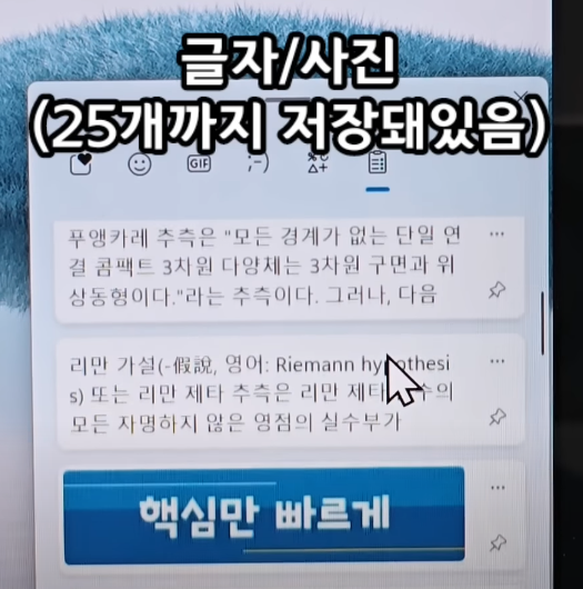 근데 이것도 다시할 필요가 없습니다. 그냥 윈도우 + V 버튼만 눌러주세요 그럼 우측에 작은 창이 뜨면서 복사해놨던 글자와 사진이 25개까지 저장되어 있는 것을 확인하실 수 있습니다.