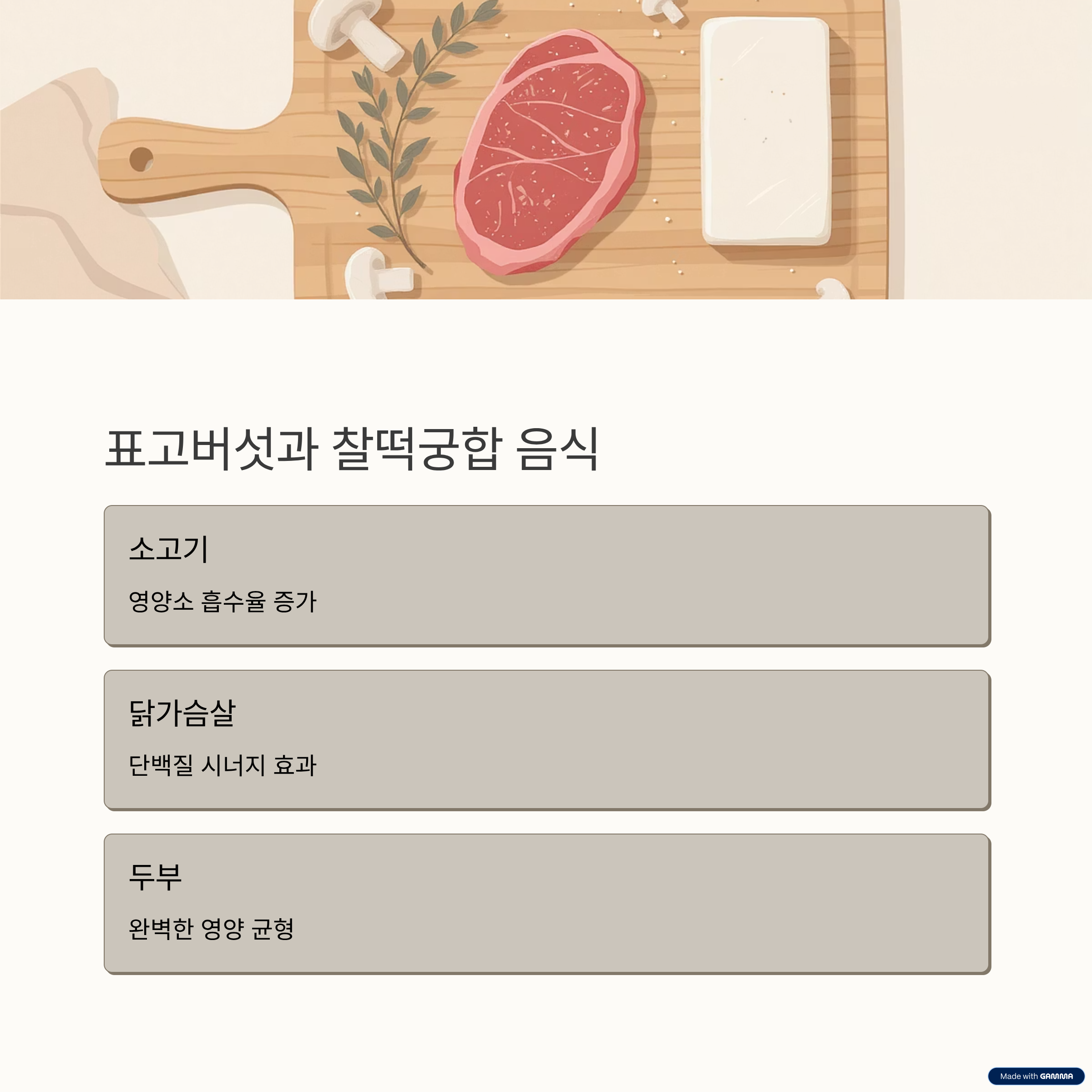 이건 정말 꿀조합이에요. 표고버섯의 비타민 D는 칼슘 흡수를 돕고, 소고기의 철분은 빈혈 예방에 좋잖아요?
